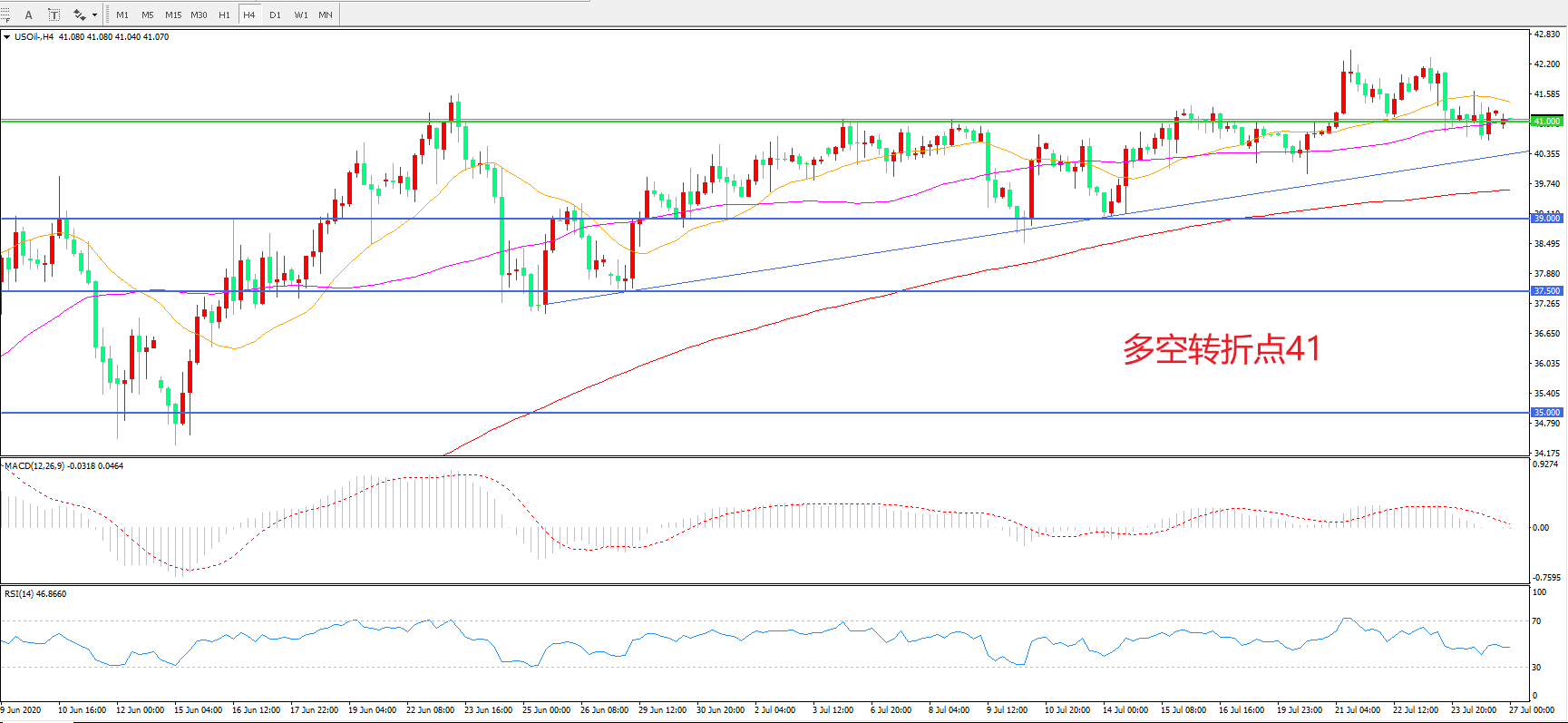 上周五(7月24日),受益于美元指数持续走软,美国WTI原油震荡反弹,收报41.23美元/桶。欧美力推财政刺激支撑了市场风险偏好,美国新一轮刺激计划也将在8月初给出结果,当前刚好是美国人喜欢驾驶汽车出行的高峰,需求方面的能否有所表现仍是影响油市未来的重要原因。