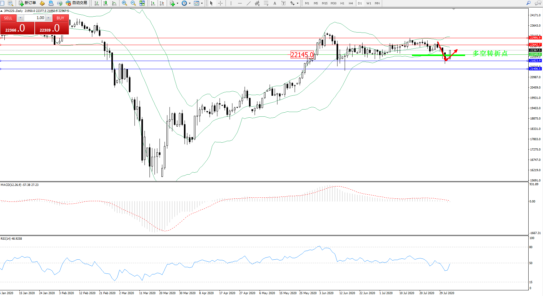 日经225指数8月3日(周一) 收盘上涨469.00点,涨幅2.16%,报22179.00点。市场对美国经济前景缺乏信心,且美国国会仍未在进一步援助法案达成共识,这限制了美元指数的反弹高度,市场仍无法排除日本央行此后入市干预的可能性,但与此同时本周出炉的美国7月非农数据仍可能给美元指数额外一击,日本7月工厂活动萎缩速度降至五个月来最慢,显示出制造商承受的压力有所缓解,并让人希望新冠疫情最严重的影响已经结束。本月稍晚将公布的国内生产总值(GDP)数据预计将显示,日本第二季经济环比年率料萎缩超过20%,因疫情打击需求。经季节调整的7月Jibun银行制造业采购经理人指数(PMI)终值升至45.2,高于6月的40.1以及7月初值42.6。整理此次调查的IHS Markit主管Tim Moore表示,PMI收复了一些第二季失土,制造商...称受到国内紧急状态解除的提振,以及有迹象显示汽车业供应链复苏,且重要出口目的地经济活动重启。