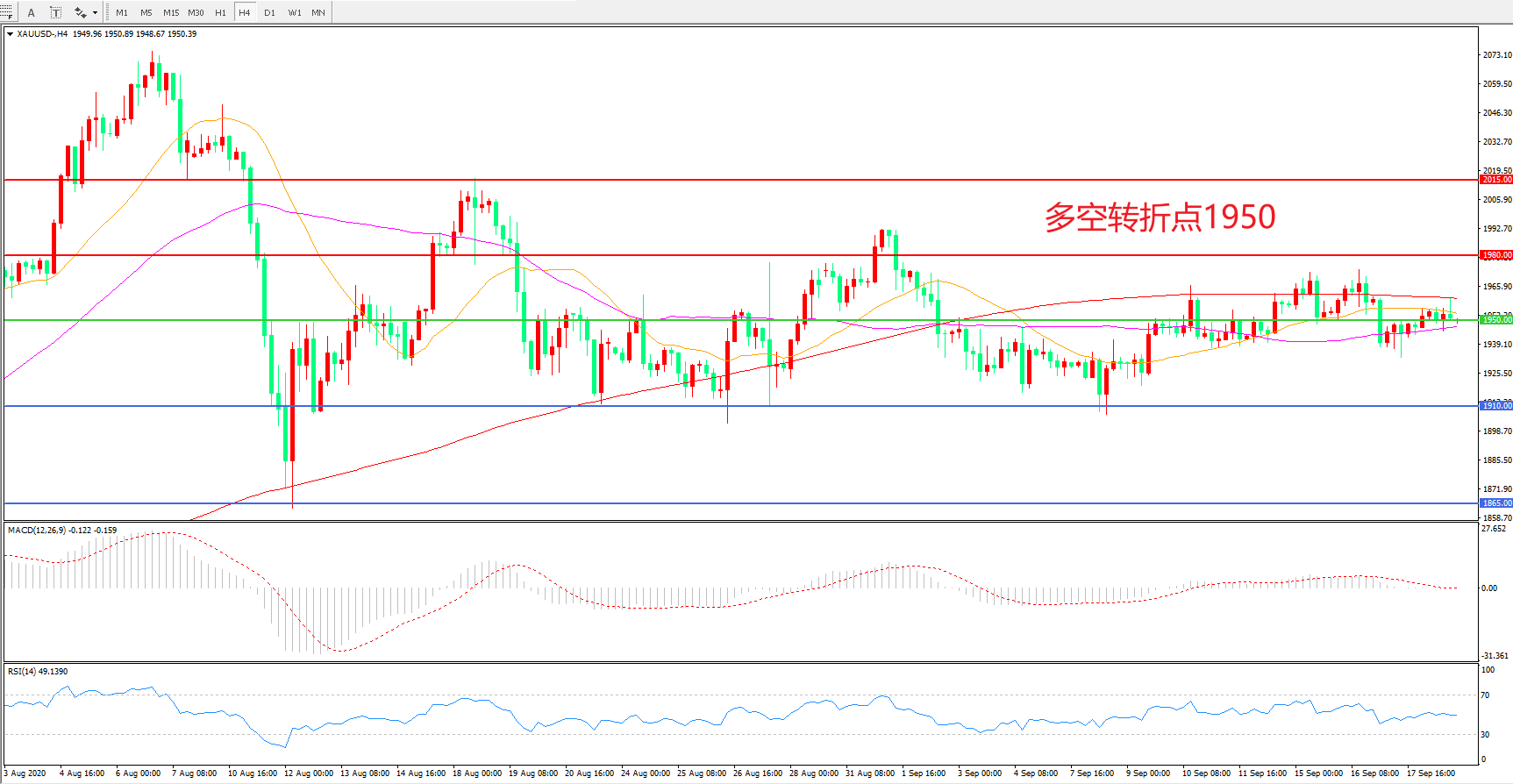4小时图看,金价冲高回落,多空博弈胶着,1950成为短期争夺焦点,MACD红柱缩短,RSI指标走平,日内延续震荡概率较大。