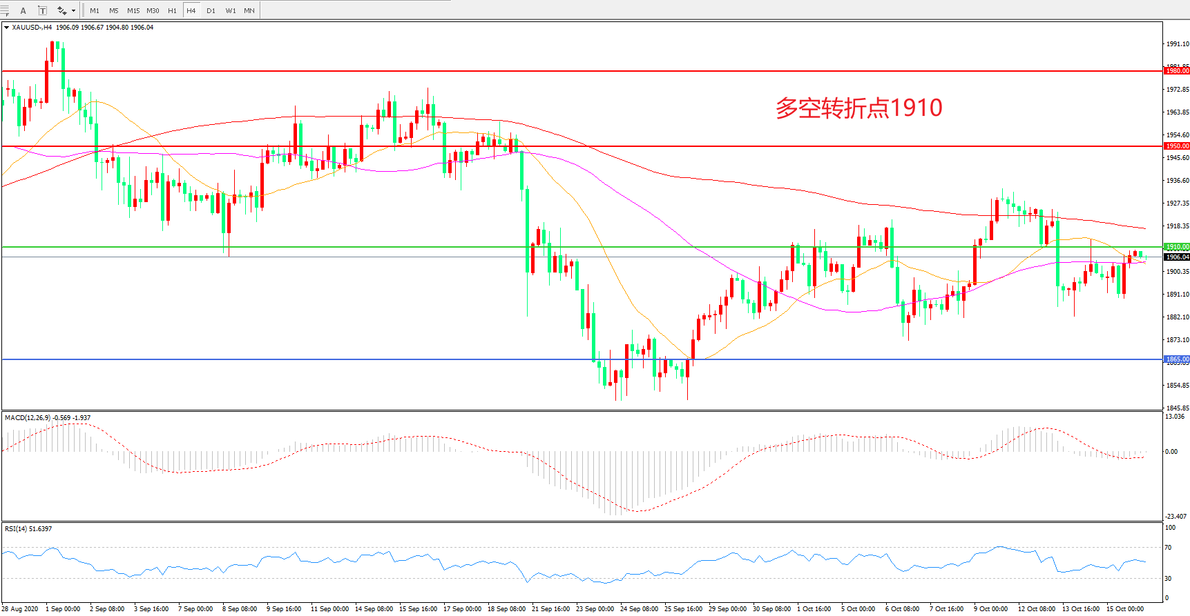 周四(10月15日),由于欧洲新冠疫情局势恶化引发市场投资者不安,美元指数盘中延续涨势,一度刷新日高至93.91,金价则陷入了两难的境地,盘中最高触及1909.06美元/盎司,最低触及1889.45美元/盎司,宽幅震荡后收报1906.60美元/盎司。