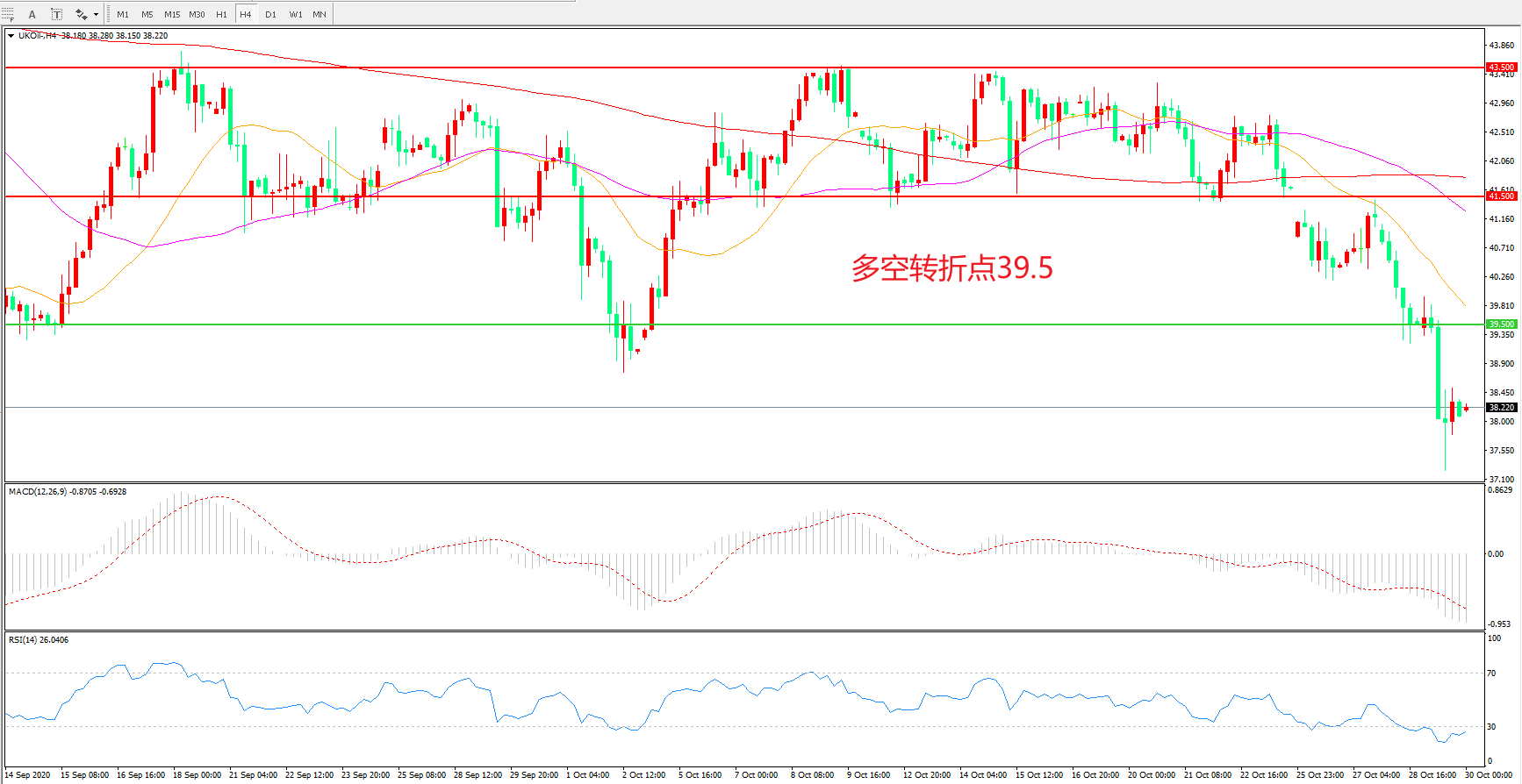 4小时图看,油价长阴连续下破,短期表现异常低迷,37美元成为短期支撑,均线系统拐头向下,MACD绿柱增加,日内延续下行概率较大。