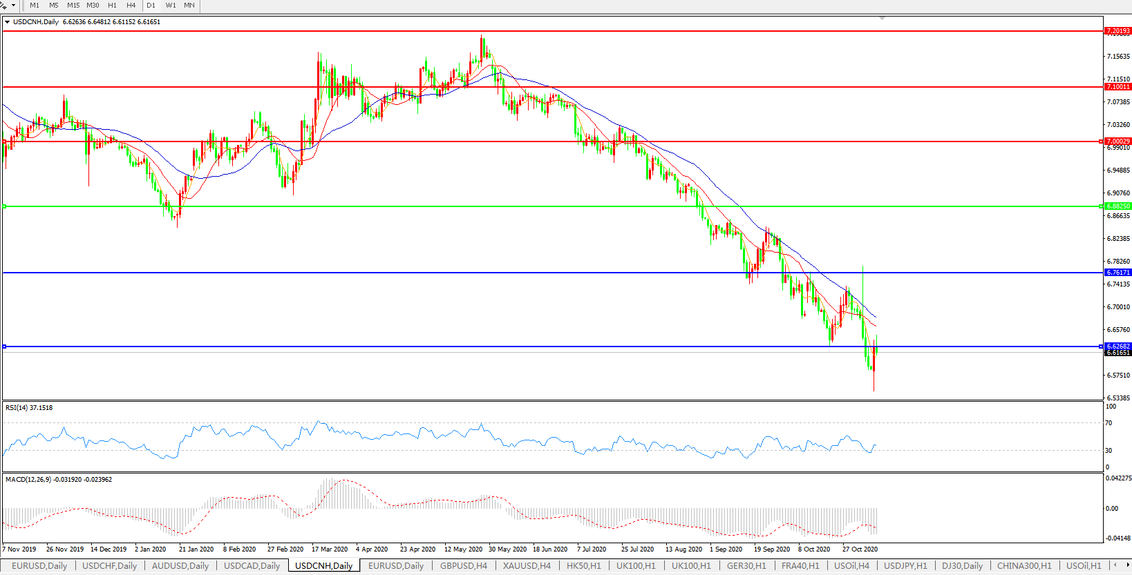 美元兑人民币USDCNH 日线图: