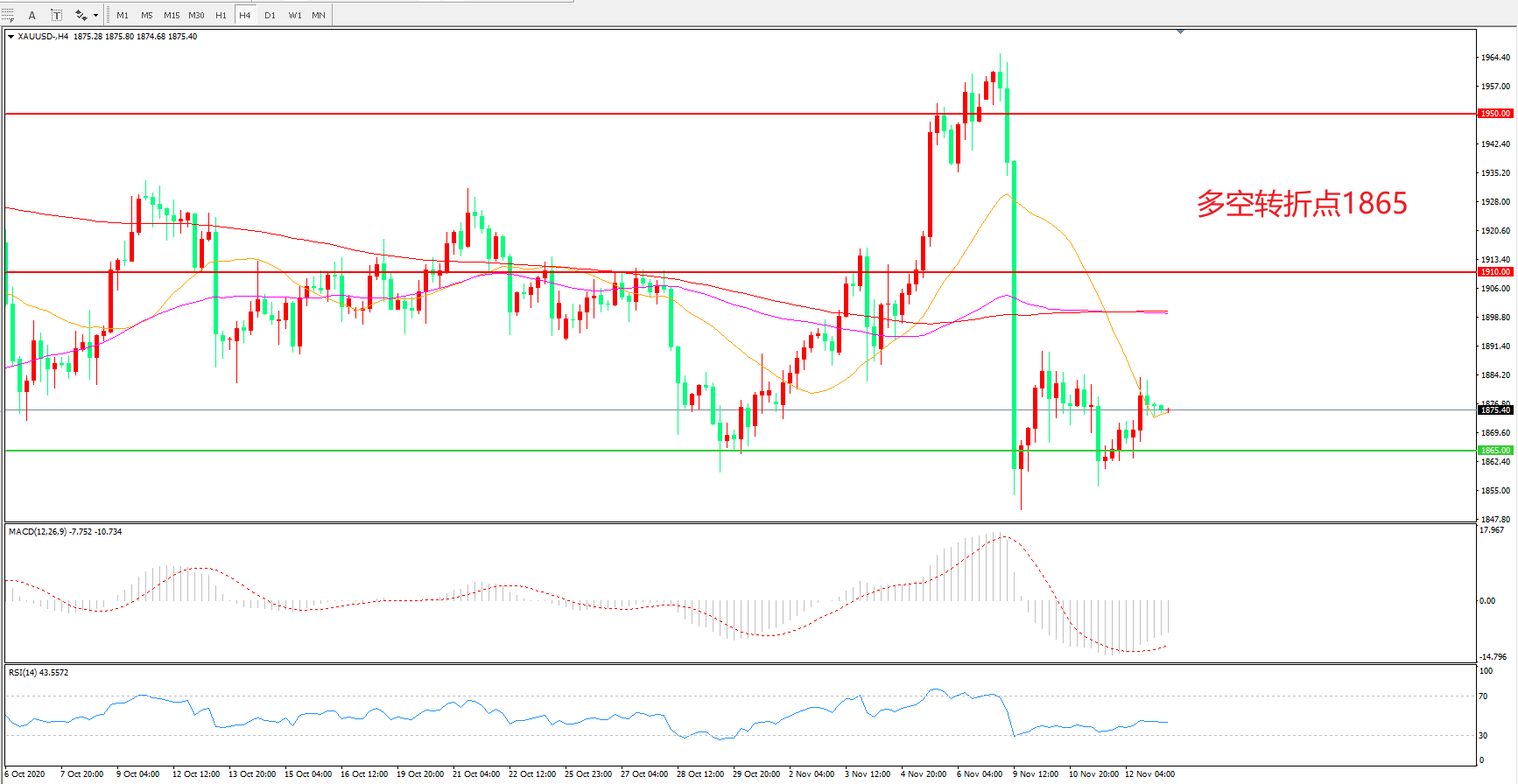 周四(11月12日),因美指反弹止步于93关口,投资者降低对新冠疫苗的乐观预期,现货黄金小幅反弹,收报1874.88美元/盎司,暂时摆脱了跌向三个多月来低谷的危险。据媒体报道,特朗普政府正在退出新一轮刺激计划谈判,而美联储主席鲍威尔鲍威尔再度重申财政刺激措施的必要性,近期主导市场的疫苗利好将逐渐减弱,财政刺激谈判进展将重新回到市场视线。