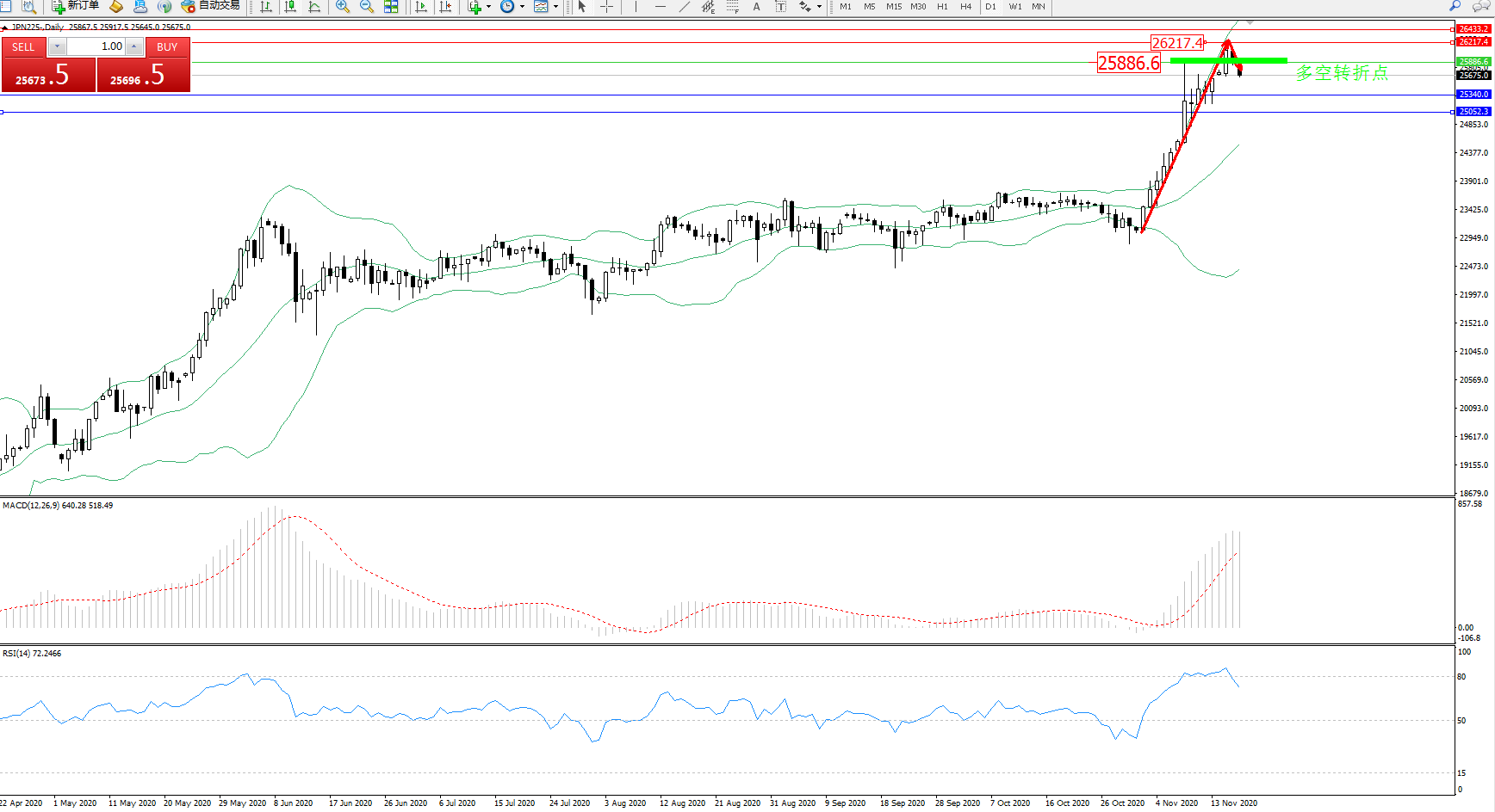 技术点评:多头动力延续布林带指标上轨附近持续震荡上扬态势良好,高位抵达26217位置附近节点后遇阻出现反转回撤下移走势,布林带指标呈张口走势后开始有收口迹象,高位空头动力有伺机入场态势,MACD指标处于多头区域强势拉升上扬后,开始平缓整理,RSI指标纠结于超买区80均衡线上方弱势震荡后有回撤下移态势;