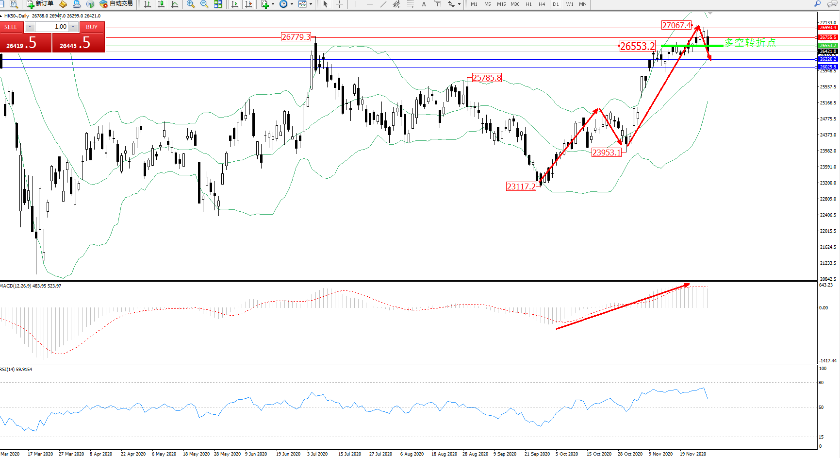 技术点评:多头动力延续布林带指标中上轨区间持续震荡上扬后,高位抵达27067位置遇阻开始震荡下行,即将触及布林带指标中轨附近节点,高位空头动力有继续下行回撤态势,布林带指标呈收口走势中,MACD指标处于多头区域高位持续整理平移中,RSI指标处于多头区域高位持续整理后出现回撤下行;