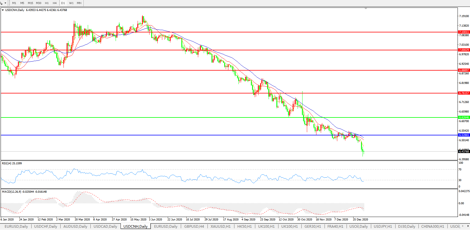 美元兑人民币USDCNH 日线图:
