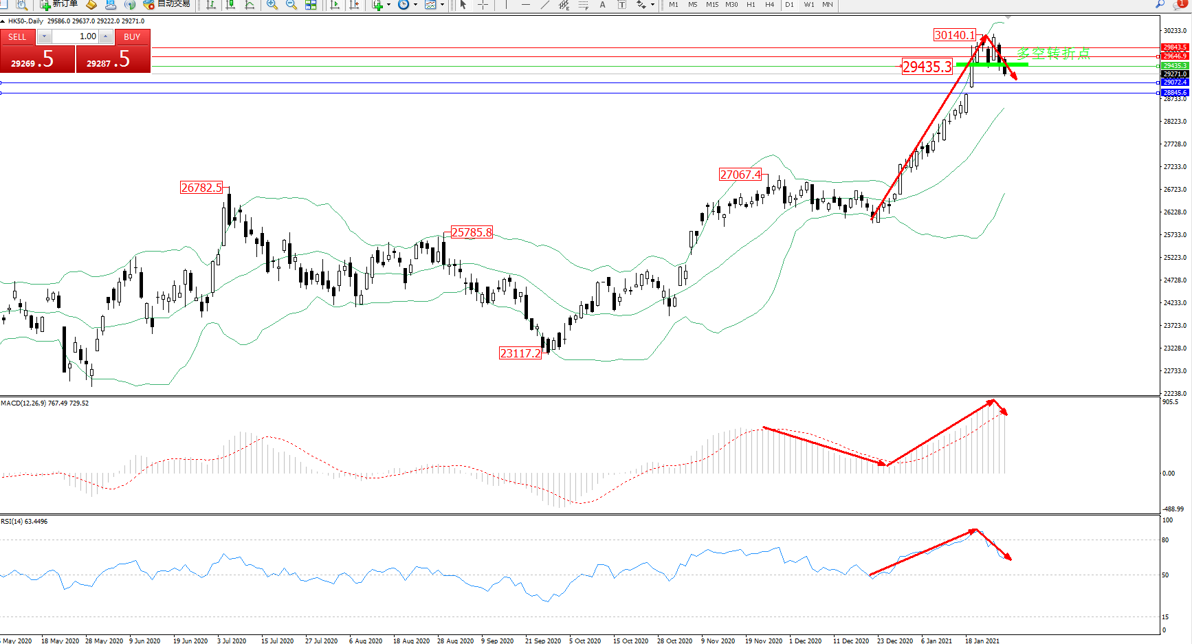 香港恒生指数1月27日(周三)收盘下跌93.73点,跌幅0.32%,报29297.53点;港股高开低走,恒指震荡收跌,近日港股指数在高位徘徊,一改此前单边上涨行情,今日盘中震荡剧烈,恒生科技指数一度大跌超3.5%。大型科技股美团跌近4%,腾讯跌超2%,两者拖累恒指下跌超140点。南下资金今日净买入港股235.3亿港元,已连续26个交易日呈净买入状态;近18个交易日中有17天净买入突破百亿,有4天净买入超200亿;年内18个交易日内,南下资金共计净买入港股2879.44亿港。本月累计南向净流入达2500亿港元,建议增加对顺周期性股份持仓,受惠增长复苏预期、内地在岸互惠基金热销,及美国总统拜登上任后中美关系缓和憧憬,A股及香港上市中资股自去年底整固后,本年至今显著上升。香港特区政府社会福利署公布,由今年2月1日起,将调高综援计划的标准项目金额,以及公共福利金计划下的高龄津贴、长者生活津贴及伤残津贴金额,并会于同日推行一系列改善综援计划的措施,包括推行「豁免计算入息」改善措施,以及把多项特别津贴扩展至合资格非长者健全受助人。