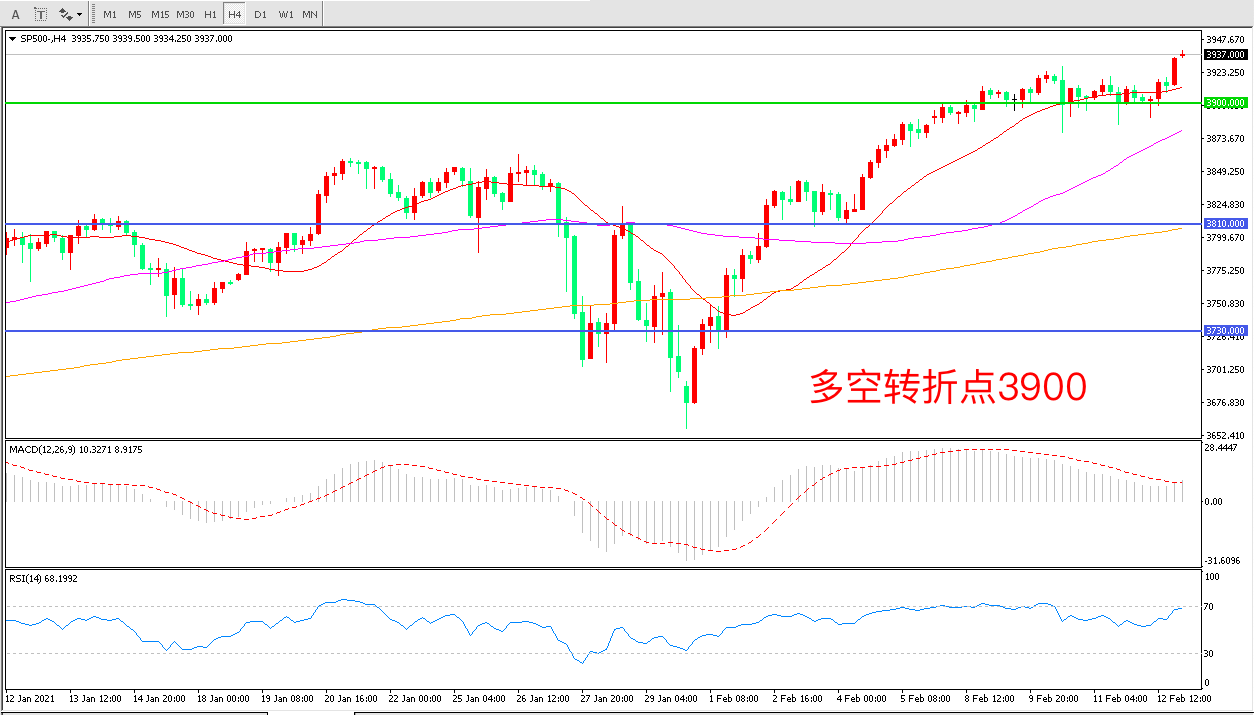 上周五2月12日),美国消费者信心意外恶化,投资者静候美国大规模财政刺激出炉的进展,美股指盘中窄幅波动,涨跌间交替,标普500尾盘大幅拉升,收报3934.00点。目前美国众议院的多个委员会已批准民主党人提议的1.9万亿美元抗疫救助计划,推动众议院在本月底以前批准整个方案。众议院议长佩洛西周四称,她认为众议院将在本月底之前通过救助方案,送交拜登批准。
