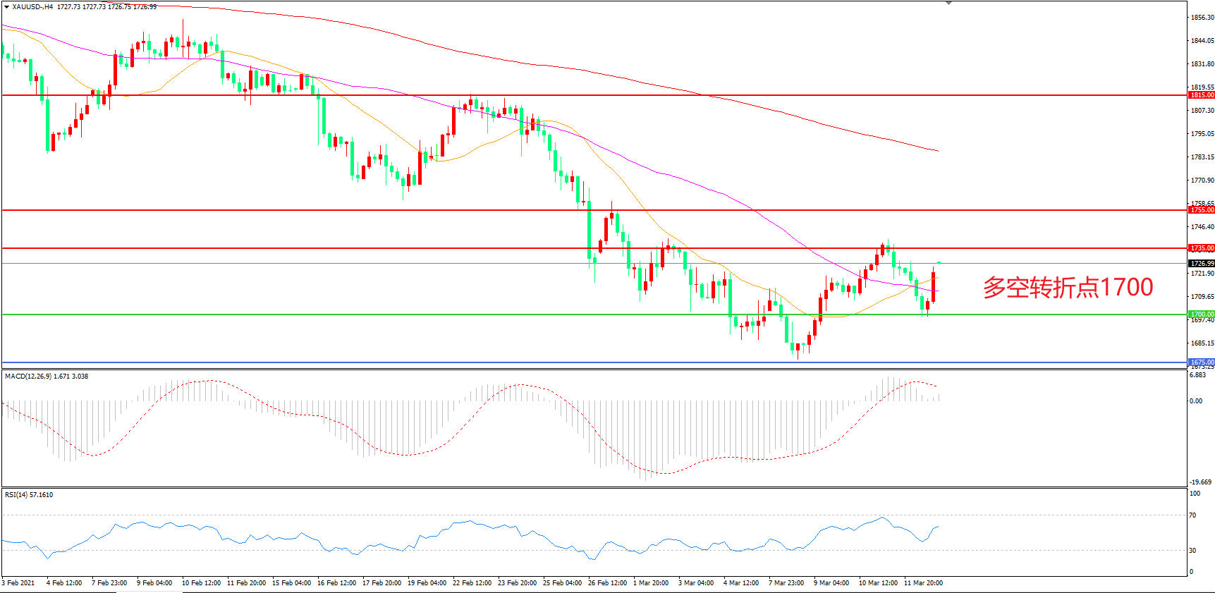4小时图看,金价回踩1700一线后连续拉升,短期表现有所回暖,形态上有形成头肩底的可能,21均线拐头上穿,形成金叉,MACD红柱增加,RSI指标向上,日内震荡反弹概率较大。