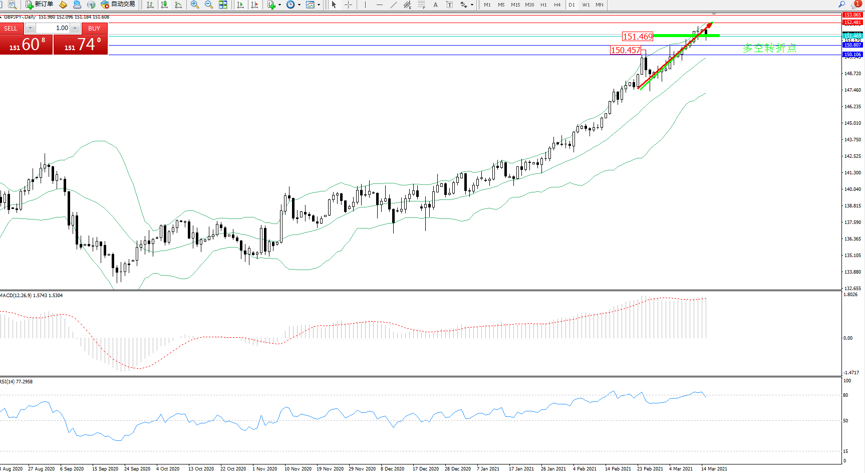技术点评:多头动力延续布林带指标上轨附近节点持续震荡上扬,屡破新高,高位短暂维持整理走势中,布林带指标通道持续拉升中,MACD指标处于多头区域高位维持整理平移中,RSI指标处于超买区80均衡线上側维持整理中;
