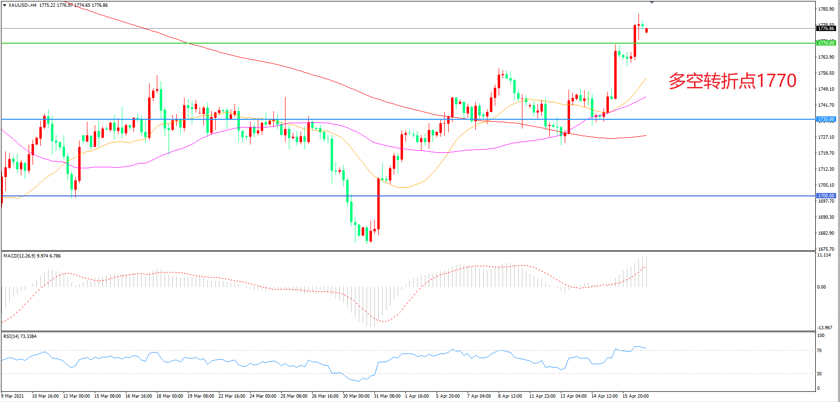 4小时图看,金价长阳拉升,突破前期整理区间,短期走势偏强,180成为上方阻力,1770成为多空分水岭,MACD红柱增加,RSI指标走平,日内震荡上行概率较大。