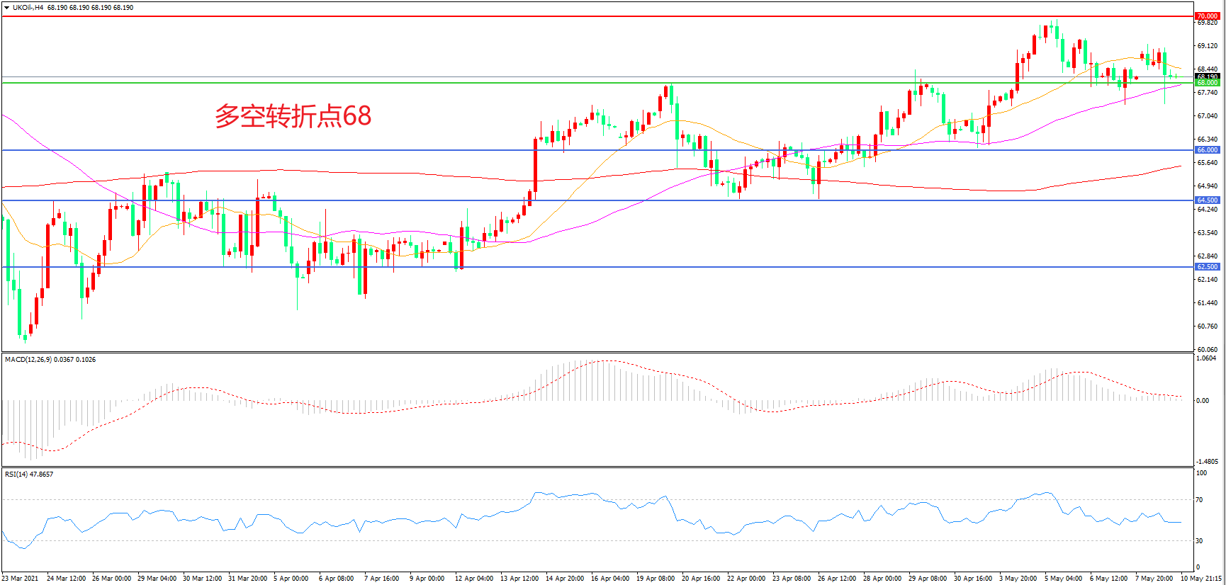 4小时图看,油价回踩55周均线后再次拉升,区间震荡迹象较为明显,70美元成为上方阻力,55周期均线成为下方支撑,MACD红柱缩短,RSI指标走平,日内延续震荡概率较大。