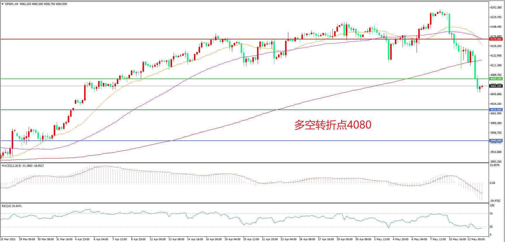 周三(5月12日),美国通胀数据如期公布,4月CPI同比增长4.2%,创2008年9月来新高,核心CPI同比增长3%,创1996年来最大增长。数据公布后,市场对高通胀的担忧再次加剧,美联储误判通胀形势,可能会被迫较预期提前开始撤除QE并加息,上周五公布的4月新增非农就业人数出乎市场意料格外疲软,叠加4月CPI高涨,令人怀疑美国陷入滞胀。大型科技股集体重挫,标普500长阴下破,收报4061点。