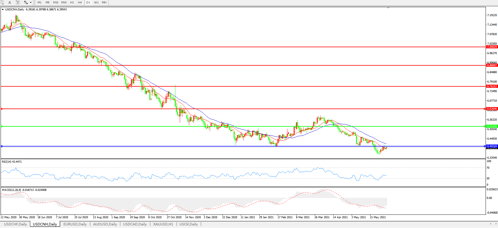 美元兑人民币USDCNH 日线图: