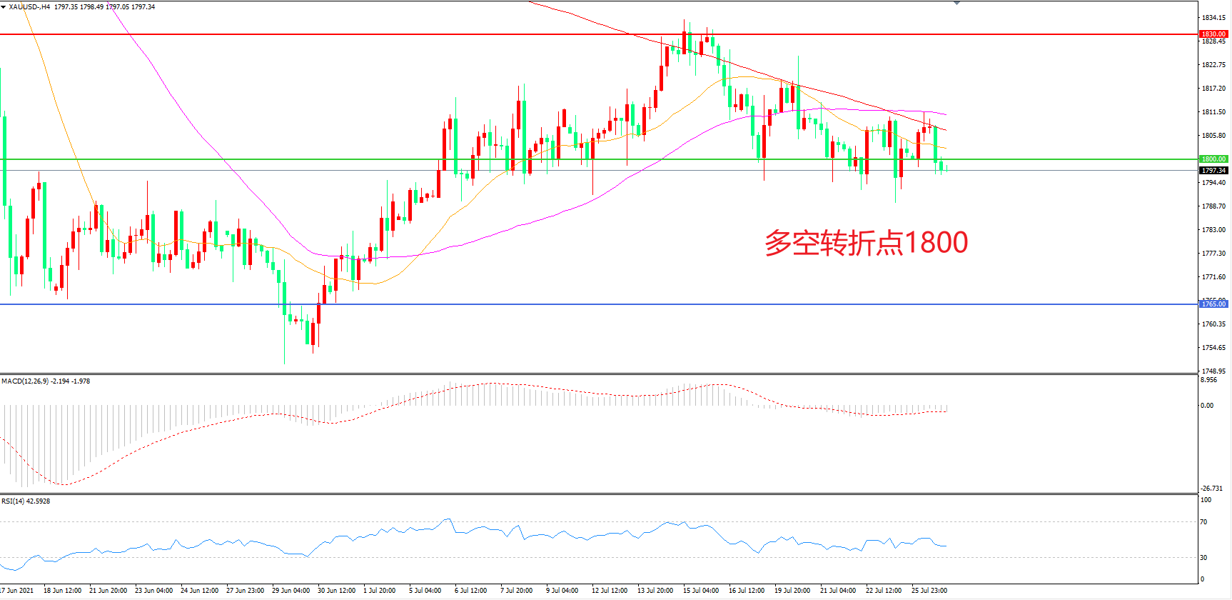 4小时图看,金价受制于均线系统压力小幅回落,弱势整理迹象明显,1800成为多空分水岭,MACD绿柱缩短,RSI指标走平,日内窄幅震荡概率较大。