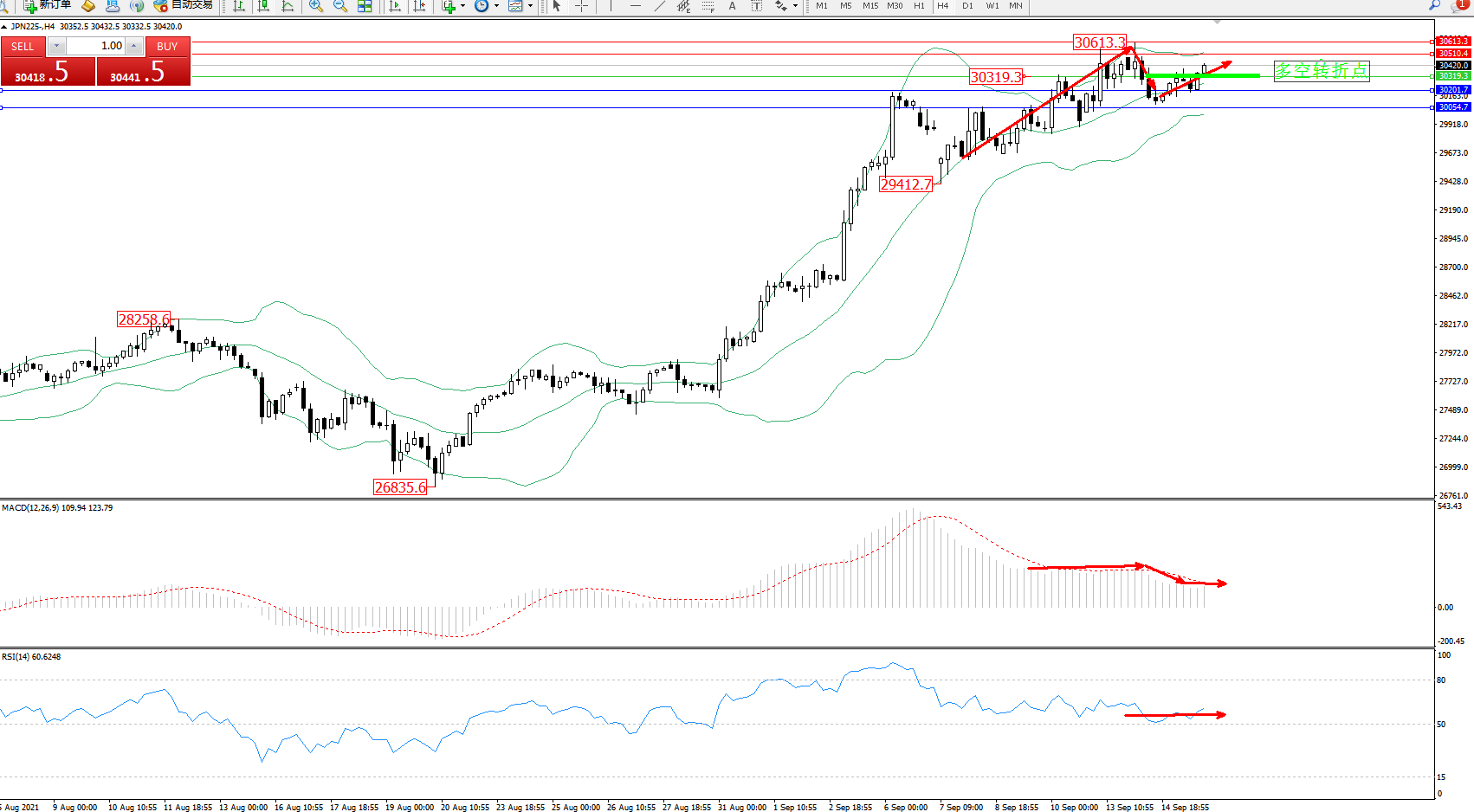 技术点评:多头动力延续布林带指标通道内持续整理向上移动,高位抵达30613位置后虽短暂回撤,但上行趋势良好,再度向上拉升,布林带指标呈收口走势中,MACD指标处于多头区域维持整理平移中,RSI指标处于50均衡线上側维持整理上行;