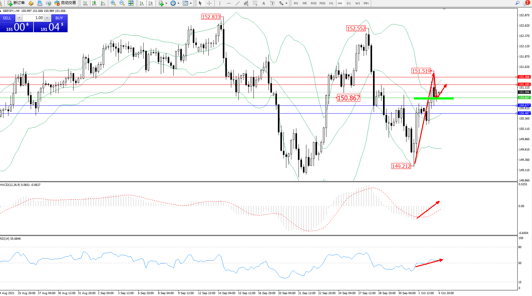 交易策略:150.867上方看涨,目标151.185、151.368