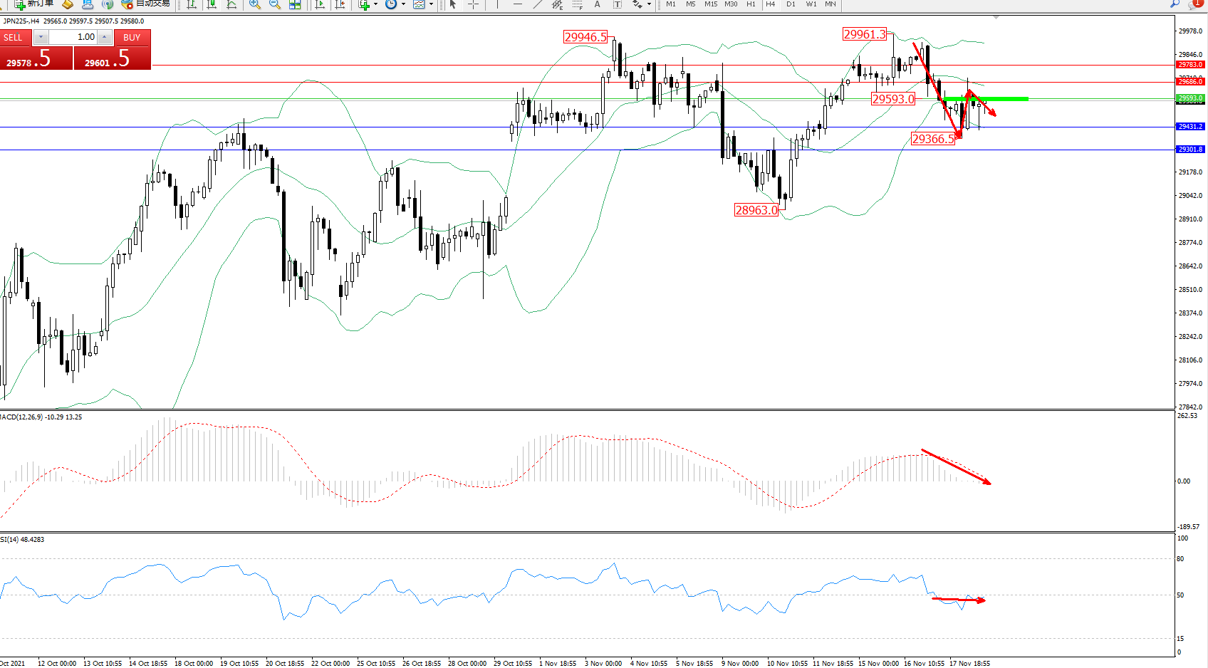 技术点评:高位空头动力短期震荡回撤下行,低位抵达29366位置节点后短暂回升,但依旧处于布林带指标通道中下轨区间持续震荡中,布林带指标呈张口走势持续中,MACD指标处于多头区域维持整理回撤至0轴线附近弱势徘徊中,RSI指标处于50均衡线下方持续整理中;