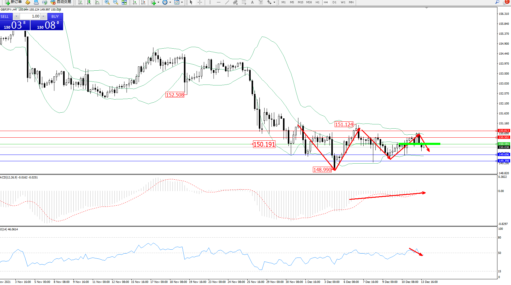 交易策略:150.191下方看跌,目标149.696、149.398