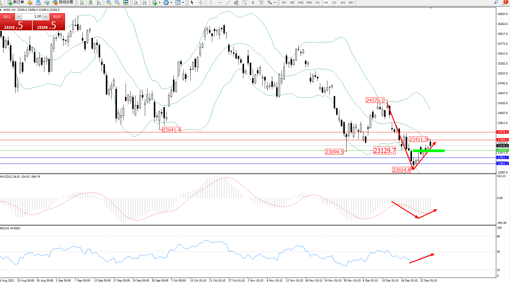 技术点评:空头动力延续布林带指标下轨附近持续震荡下行,低位抵达22654位置得到支撑反转上扬,触及布林带指标中轨附近节点后,短暂整理,布林带指标呈收口走势良好,短期多头动力上移开始减弱,MACD指标处于空头区域低位震荡上移,RSI指标处于空头区域低位震荡缓慢向上移动中;