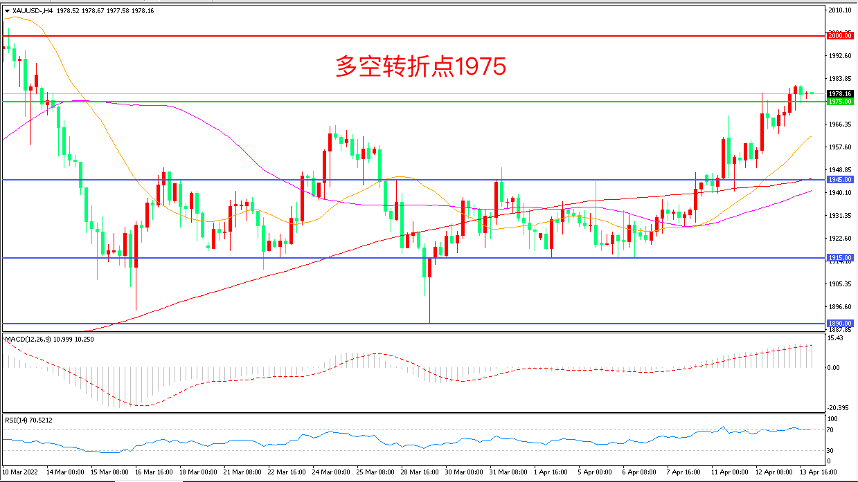 周三(4月13日),因欧元在欧洲央行政策会议前由跌转升,俄乌局势再度紧张等因素,美元指数自高位回落,现货黄金延续强势表现,收报1977.67美元/盎司。在美国公布3月CPI、PPI数据后,席卷而来的高通胀已成事实,战争、封锁、供应链混乱都导致通胀飙升,作为传统的抗通胀资产,黄金仍将受到投资者追捧。