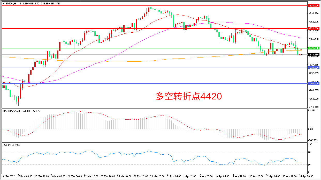 周四(4月14日),美联储激进行动打压通胀的预期再度升温,此前“跳水”的美国国债收益率盘中拉升,标普500受到打压,收报4438.50点。除了面临着央行加息的冲击,美股近期还面临财报季的考验,受4月15日耶稣受难日影响,美股休市一日。
