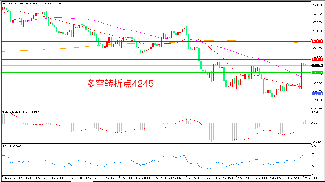 4小时图看,标普500以21周前均线为依托长阳拉升,短期走势偏强,4245成为多空分水岭,MACD绿柱缩短,RSI指标走平,日延续震荡概率较大。