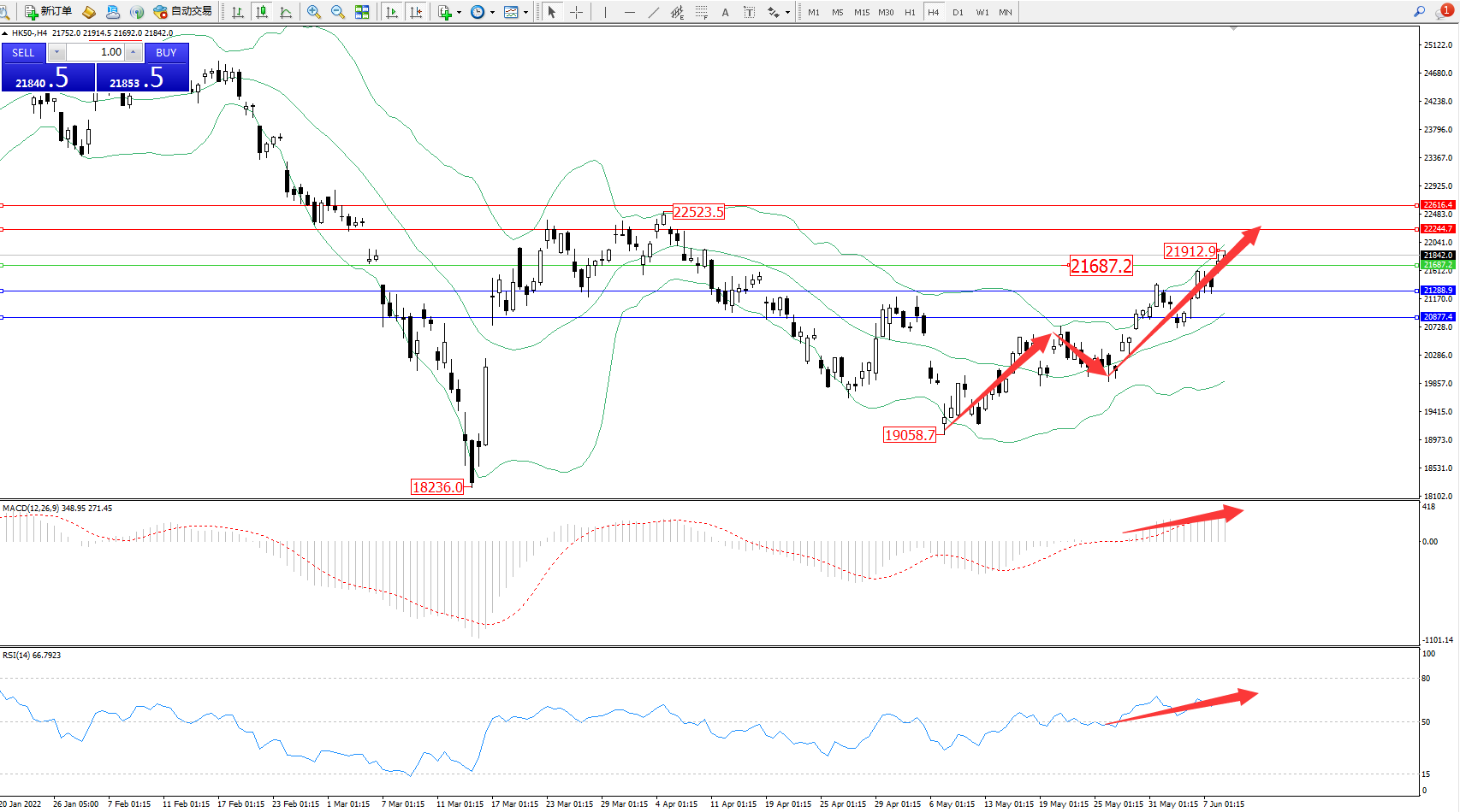 香港恒生指数6月8日(周三)收盘上涨482.92点,涨幅2.24%,报22014.59点;港股全天表现强势,科技股狂欢,市场情绪高涨。恒指时隔2个月重回22000点,恒生科技指数涨4.76%,重上4800点上方亦创反弹新高。大型科技股尾盘涨幅加大,阿里巴巴大涨超10%,百度、京东、腾讯均涨超6%,有市场人士分析,监管不断释放利好消息或是主因,而随着复工复产有序推进,美国有望取消部分关税以及游戏版号审批放量,都持续刺激着市场风险偏好,对大幅回调的科技股形成支撑。