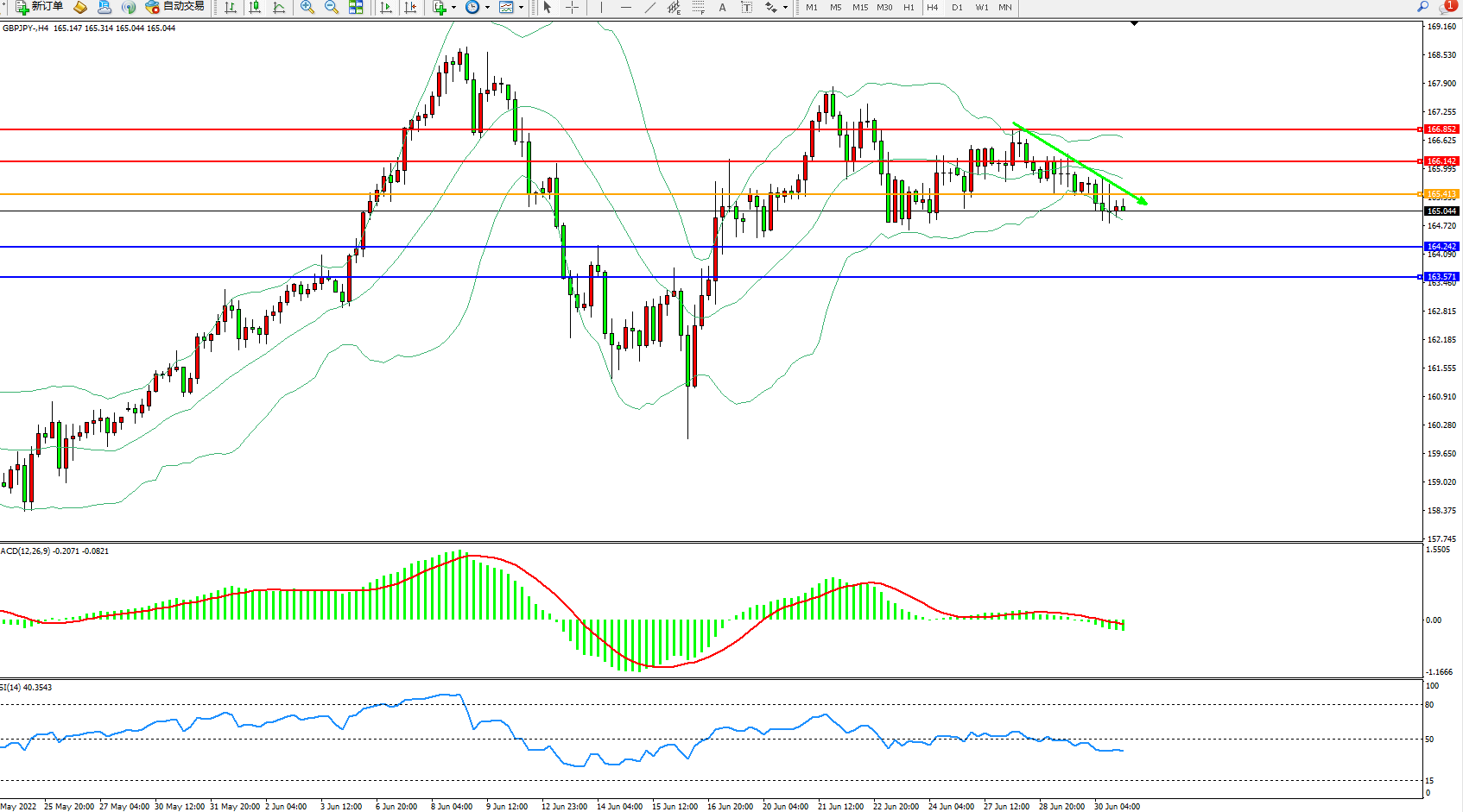 4小时图看:高位短期维持窄幅震荡走势,波幅空间逐渐收窄,布林带指标呈收口走势后开始缓慢张口,MACD指标处于0轴线下侧徘徊,RSI指标处于50均衡线下侧整理;