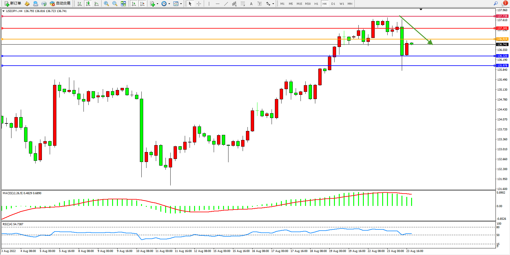 交易策略:136.919下方看跌,目标136.320、135.978