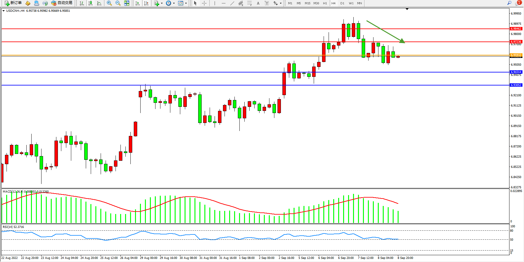美元人民币USDCNH——4小时K线图显示: