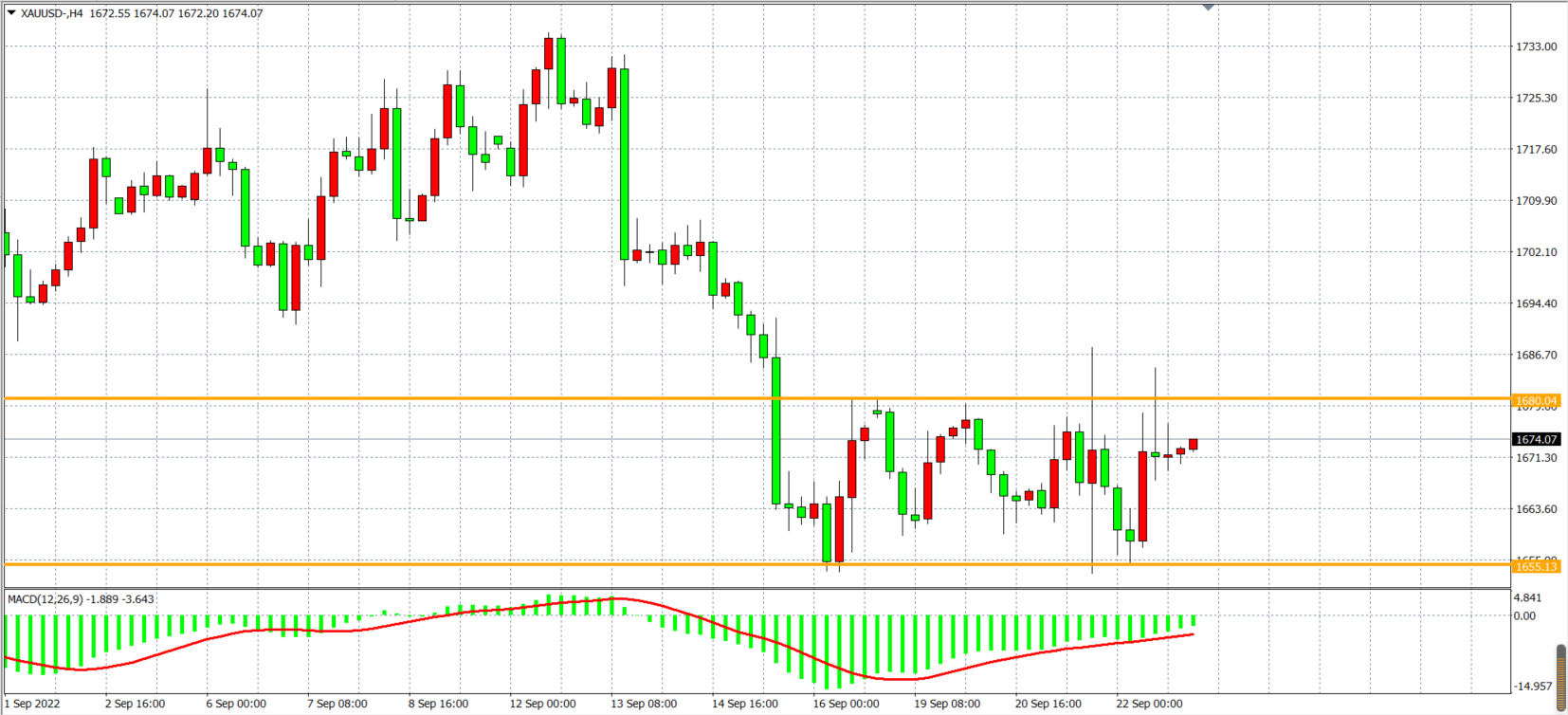 4小时图看,金价再度反弹至1680一线受阻回落,MACD于零轴之下量能持续缩小,显示上攻动能后劲不足,走势再度进入焦灼,延续1655-1680的箱体区间整理,该箱体未破前以震荡操作看待,高空低多为主