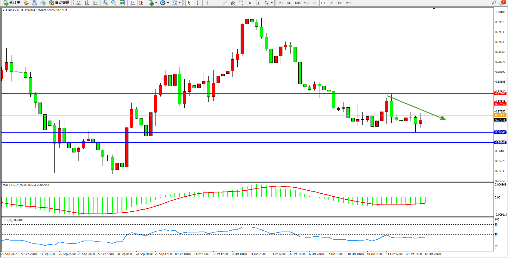 4小时图看:高位空头动力维持弱势整理下移,低位窄幅徘徊,短期空头情绪有减弱迹象,MACD指标处于0轴线下侧窄幅整理,RSI指标处于50均衡线下侧弱势徘徊;