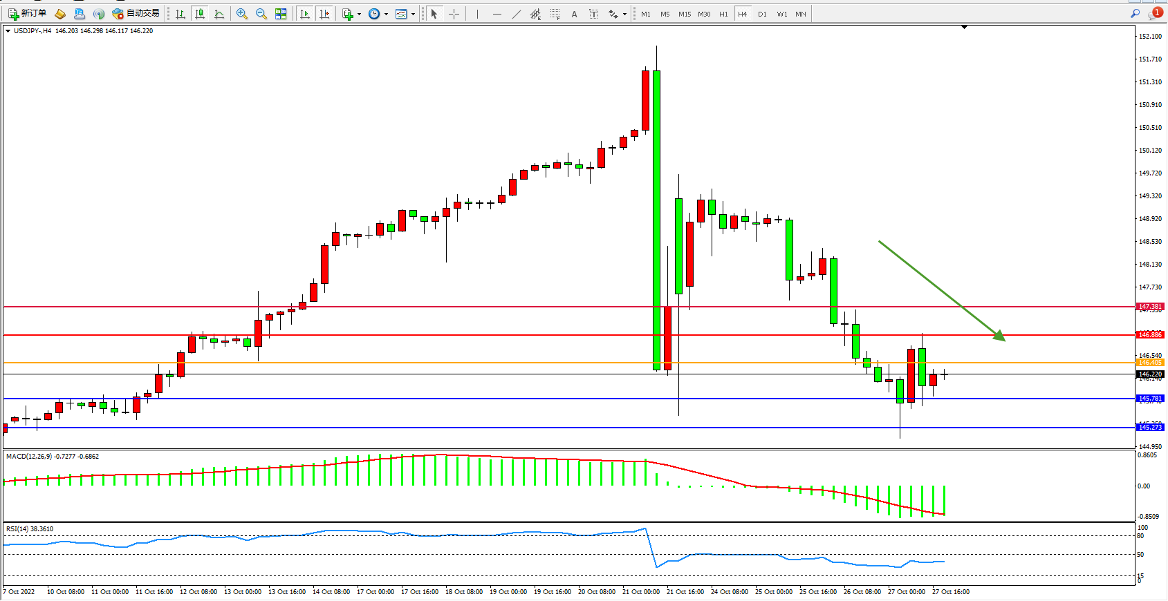 交易策略:146.405下方看跌,目标145.781、145.272