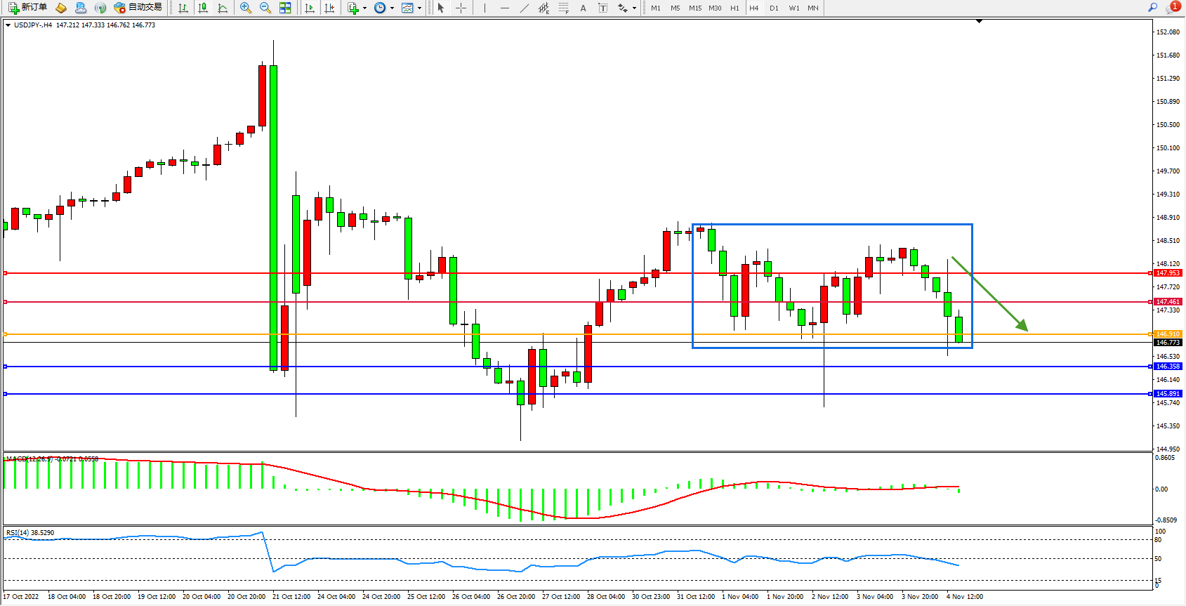 4小时图看:短期维持低位区间震荡后,空头再度下移,市场短期或纠结此位区间震荡,MACD指标处于0轴线附近弱势徘徊,RSI指标处于50均衡线下侧弱势整理;