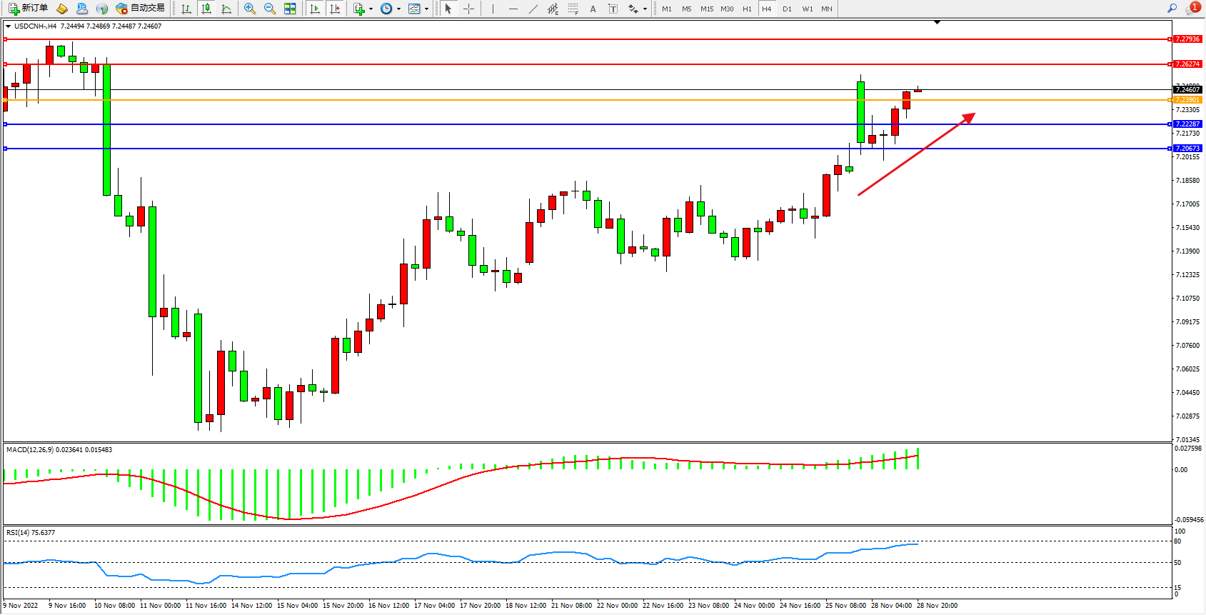 美元人民币USDCNH——4小时K线图显示: