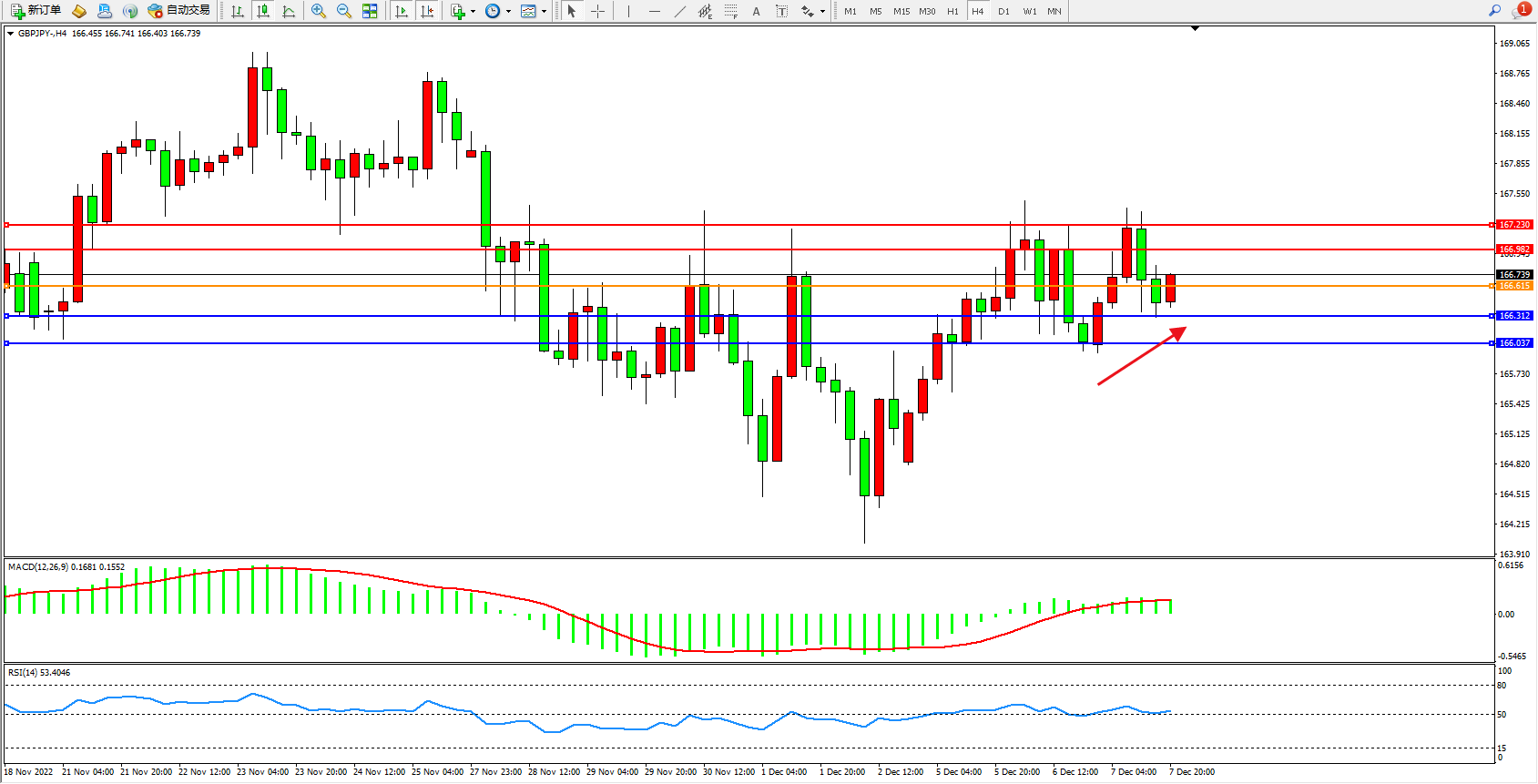 4小时图看:短期区间宽幅震荡,市场多空动力均处于焦灼状态,市场买盘有伺机入场,MACD指标处于0轴线上側弱势徘徊,RSI指标处于50均衡线附近弱势整理;