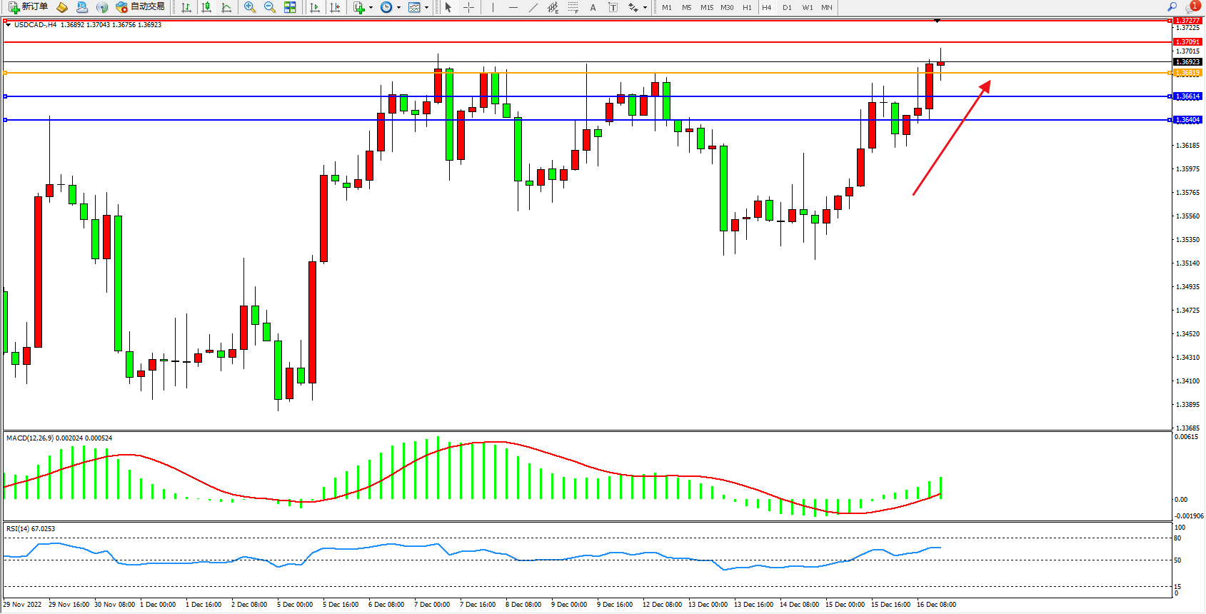 美元加元USDCAD——4小时K线图显示: