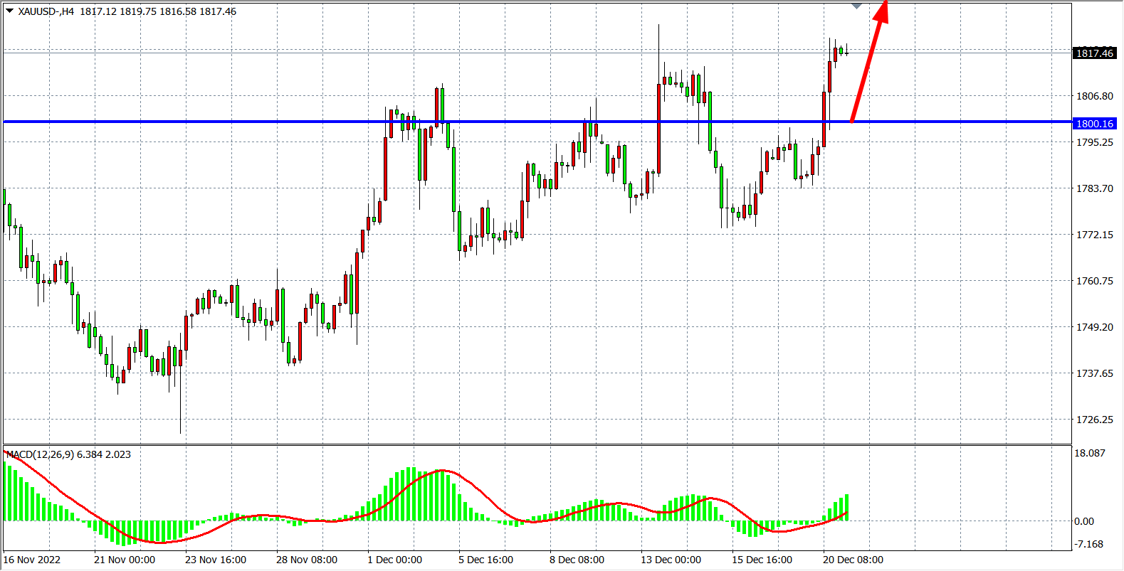 周二(12月20日)日本央行宣布将10年期国债收益率上限提高了一倍,这个突然的政策调整震惊了市场,美元兑日元盘中暴跌近5%,一度跌破131,美元指数受拖累全日走低,盘中跌破104关口,最终收跌0.69%。得益于美元下跌,现货黄金盘中突破1820美元/盎司,收涨逾30美元,涨幅1.69%。展望后市,随着金价再次站上1800关口,上行前景或重新打开。