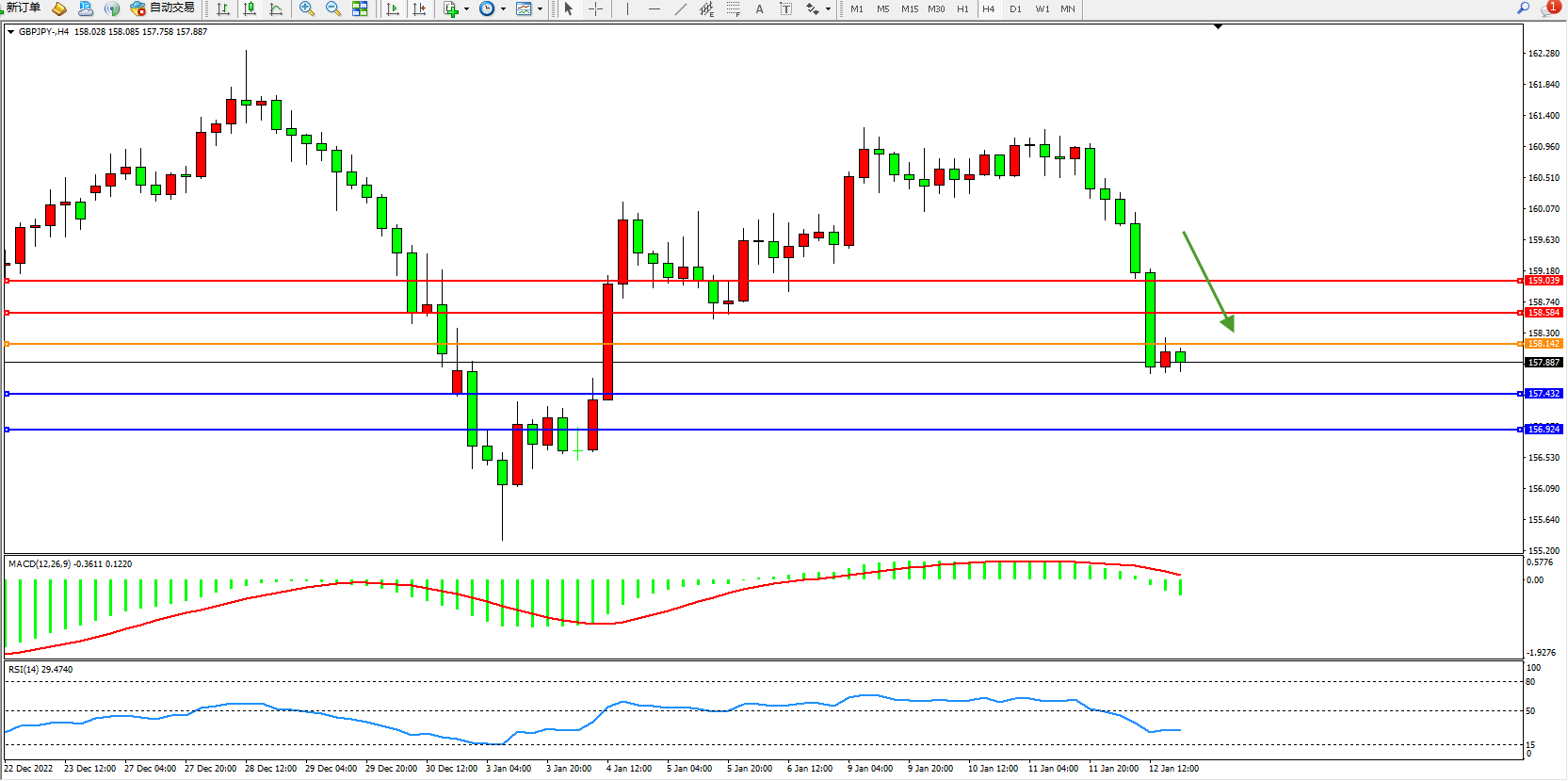 交易策略:158.142下方看跌,目标157.432、156.924