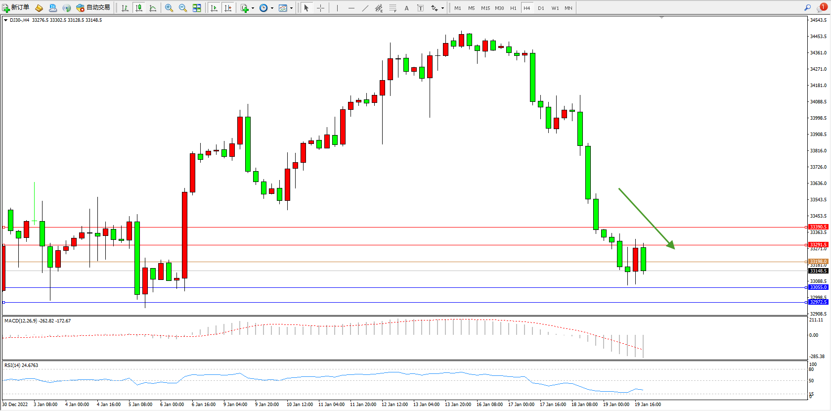 道琼斯指数1月19日(周四)收盘下跌252.33点,跌幅0.76%,报33044.63点;美国上周初请失业金人数意外减少,降至去年9月以来的最低水平,突显出就业市场强劲,许多企业不愿裁员。截至1月14日当周,首次申请失业救济的人数减少1.5万人,至19万人,预测中值为21.4万人。这些数据尤其不稳定,很难在假期前后进行季节性调整。