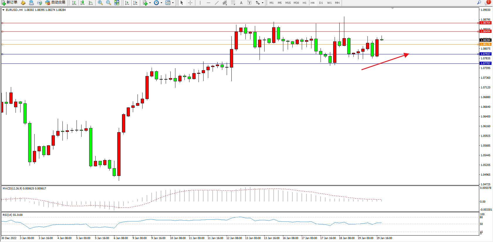 欧元美元EURUSD—4小时K线图显示:
