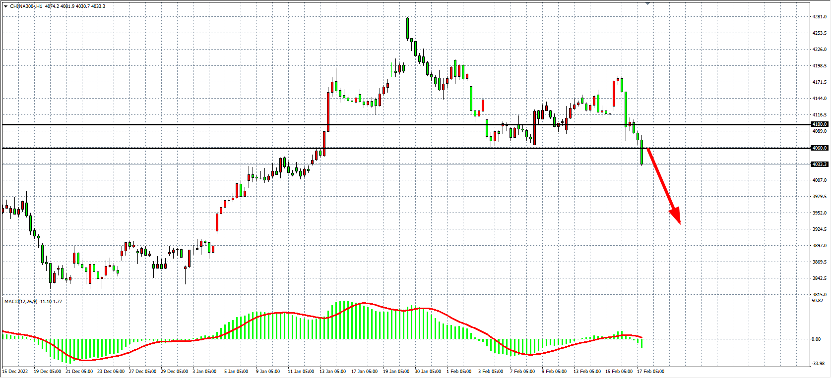 4小时图看,沪深300跌破4060支撑,出现大阴线强势下破,空头趋势进一步加强,同时MACD于零轴之下量能开始放大,短线走势继续看空为主,当前4060-4100为阻力区域,下方目标看4000-3950。