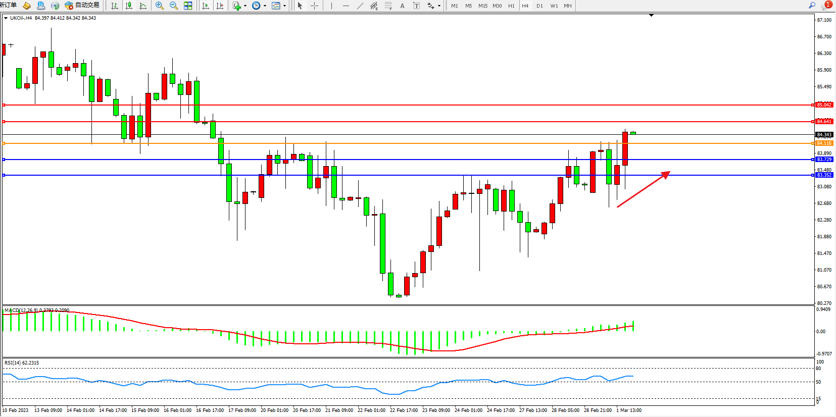 4小时图看:多头动力维持震荡上扬,短期看涨情绪依旧,市场整体处于偏涨势,MACD指标处于多头区域缓慢上行,RSI指标处于50均衡线上側整理;