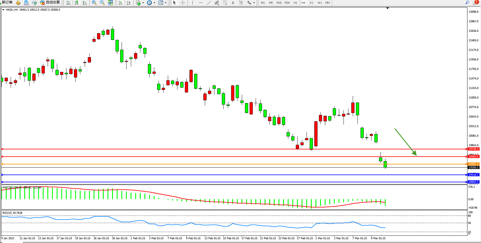 香港恒生指数3月10日(周五)收盘下跌605.82点,跌幅3.04%,报19319.92点;隔夜美银行股暴跌致美股大幅下挫,市场恐慌情绪急速蔓延。港股尾盘跌幅扩大,恒生科技指数跌3.78%,恒指、国指分别跌3.04%和3.06%,恒指下挫600点。本周三大指数加速下跌,恒指累跌6%失守2万点大关。大型科技和齐挫大市承压,京东绩后跌超11%,百度、快手跌超5%,阿里巴巴、腾讯、美团等均走低;行业板块近乎全部下跌,行业“内卷”加剧,南下资金净流入34.36亿港元,大市成交额放大至1664亿港元。