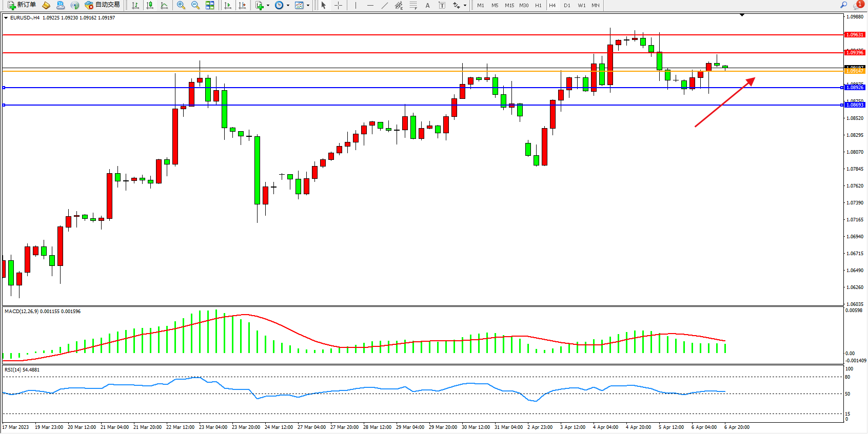 4小时图看:高位短期维持震荡,市场整体处于高位上行遇阻回撤后整理,短期或维持高位整理,MACD指标处于0轴线上側整理,RSI指标处于50均衡线上側徘徊;