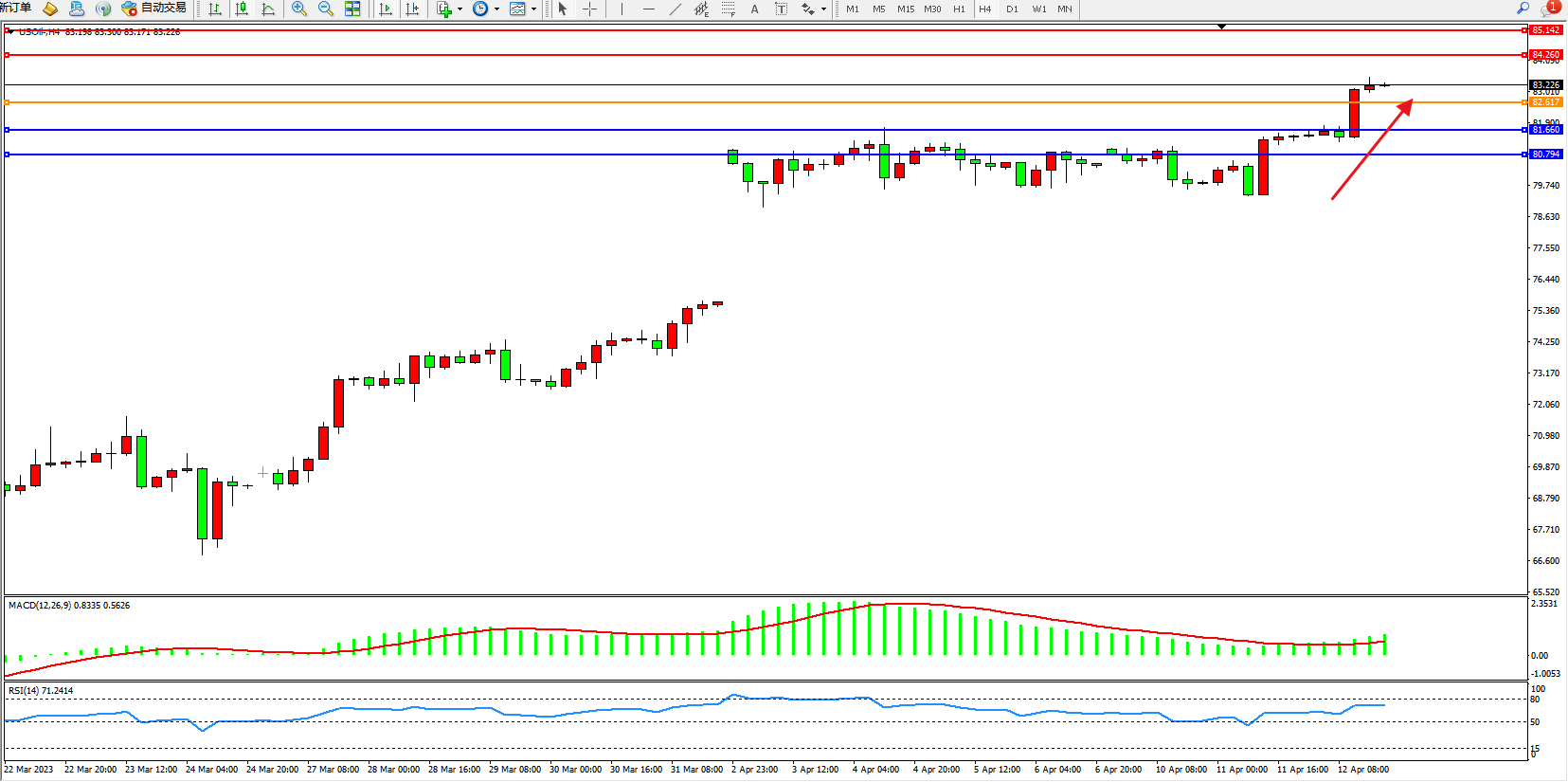 原油维持83.226附近震荡,EIA报告:04月07日当周美国国内原油产量增加10.0万桶至1230.0万桶/日,美国原油产品四周平均供应量为2003.9万桶/日,较去年同期增加0.72%。