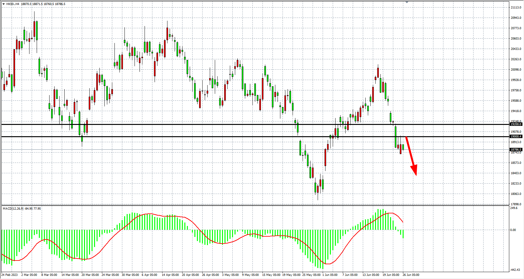 4小时图看,恒指在19000点之下继续走弱,MACD量能看零轴下继续放大,趋势延续空头,阻力关注19000-19200,下方目标看18500-18200。