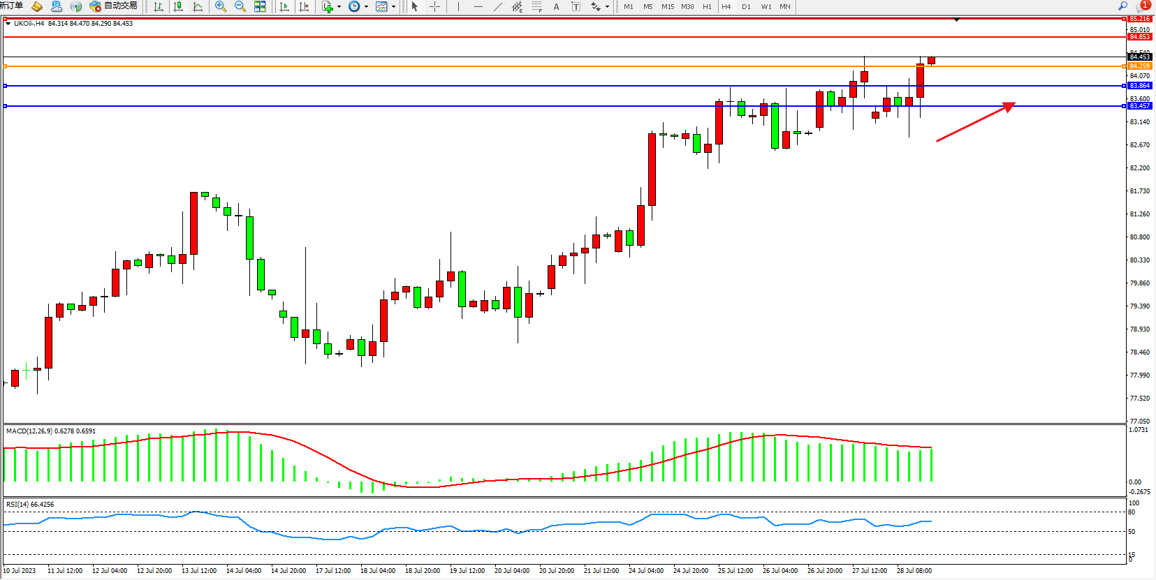 4小时图看:高位多头整理缓慢上行,市场多头不断向上移动,短期有继续向上移动迹象,MACD指标处于多头区域维持整理,RSI指标处于多头区域徘徊;