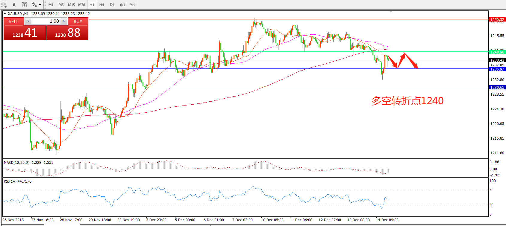 周五(12月14日)因美国公布的11月零售销售数据好于预期而进一步美元进一步反弹上扬,而黄金在经历了上周的大涨之后触及月内高位后转跌,已下破1240关口,处于窄幅波动区间。过去的一周内,新兴市场趋于稳定,中美贸易紧张关系在一定程度上有所缓和,风险情绪骤降,而美联储官员的鸽派言论迫使市场开始定价美联储2019年暂停升息的可能性,本周市场将迎来美联储货币政策会议,这也是今年最后一次会议,届时将做出今年最后一个货币政策决定,并将为2019年初定下基调。而市场普遍预期美联储本次会议将加息。